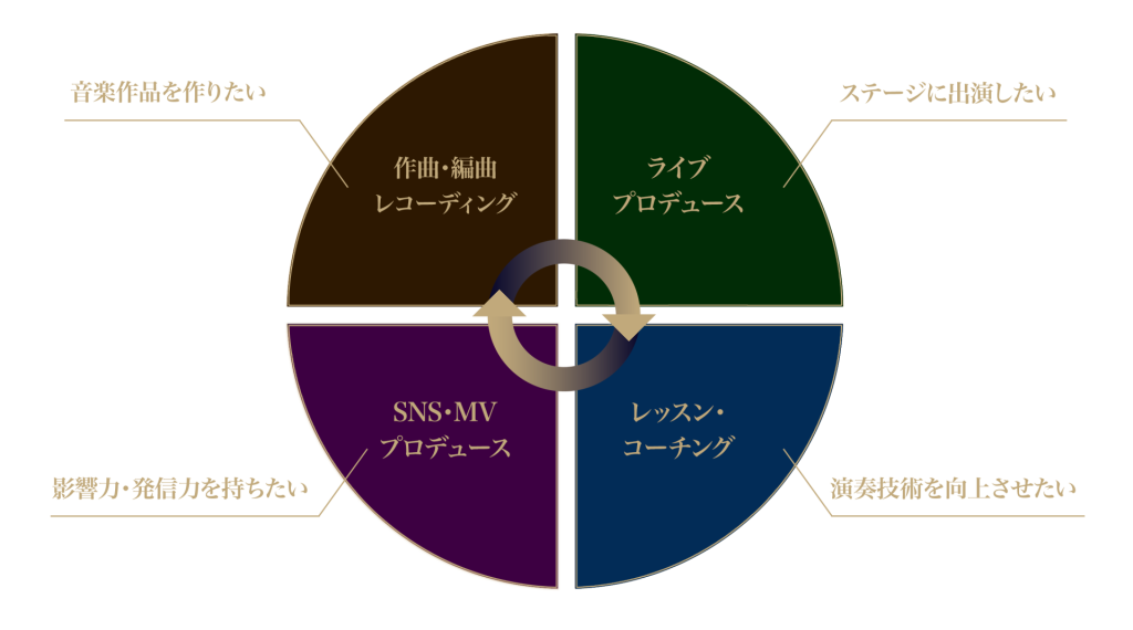 作詞作曲、SNS発信、配信やライブの企画運営まで、実績と経験豊富なプロの音楽チームが、あなたの「こうなりたい」を形にします。